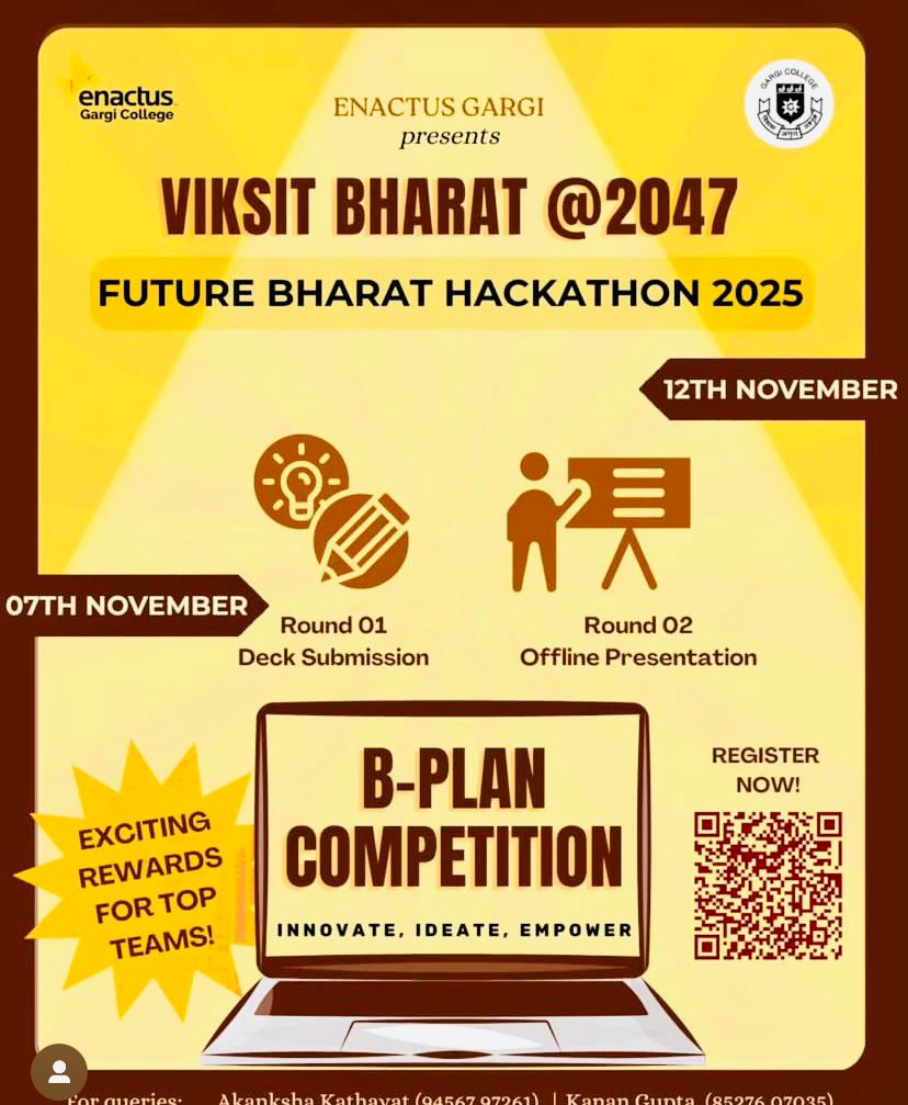 Our Director, Ms Priti Goel was invited as a Judge to Enactus Gargi Viksit Bharat@2047 Hackathon 2025 held at College Campus, University of Delhi on November 13, 2025